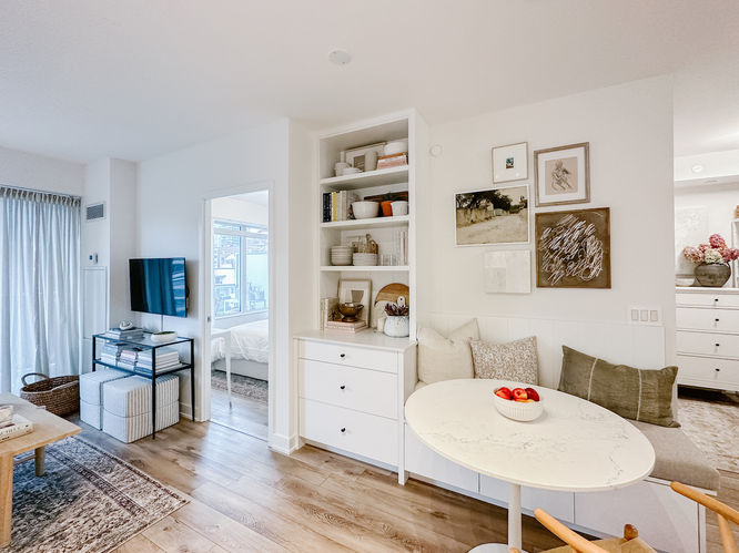 Our primary goal for this project was to add storage and maximize the functionality of this small, new build condo unit. Through adding custom built-ins, furnishing and decor, we were able to achieve a space that felt spacious, airy and lived-in.